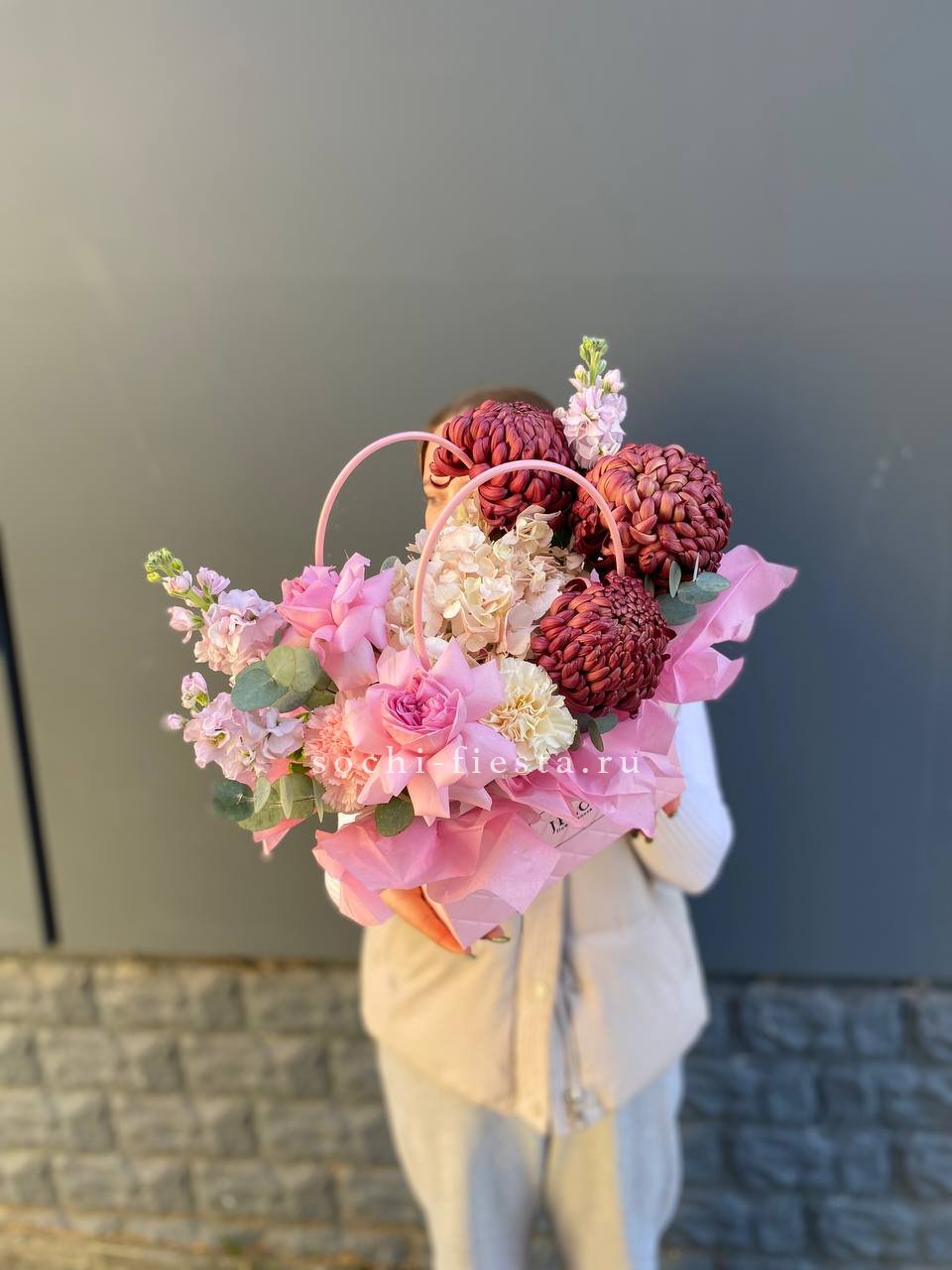 бигуди, розовые розы, гортензия, маттиола, эвкалипт, диантусы, сумочка.