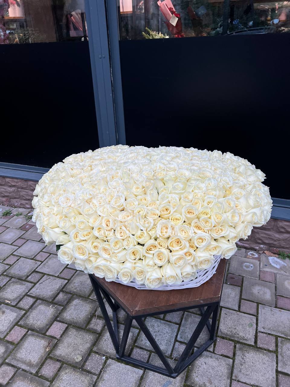 Пятьсот пятьдесят пять роз в корзине с персональной надписью — это целая инсталляция из живых цветов. Объём композиции впечатляет масштабом и создаёт незабываемое визуальное присутствие.
