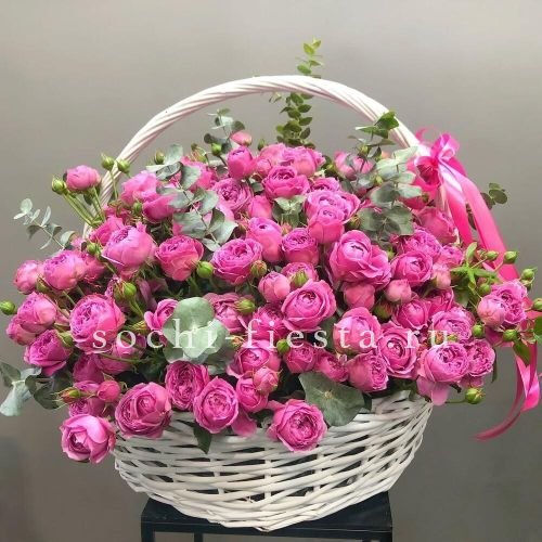 кустовые розы, одноголовые розы, диантусы,  гортензия, эустома, антиринум, озатамус, хризантема, герберы, лента, светлая корзина.Состав может меняться в зависимости от сезонности.
