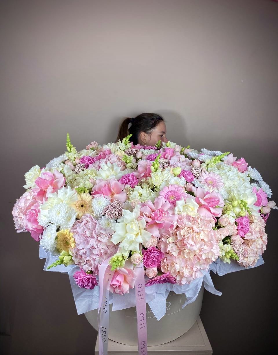 коробка с цветами разноцветного градиента (гортензии, розы, герберы, диантусы, кустовые розы, альстромерии, хризантемы, антирринум, озотамус).