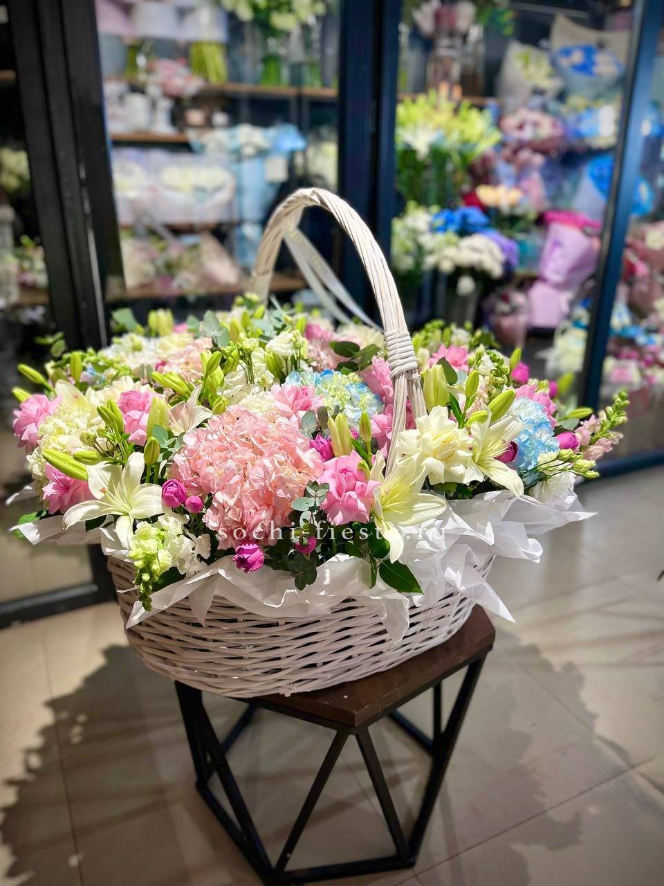 Масштабная корзина объединяет лилии, гортензии, антиринум, розы и эустому в единую объёмную композицию. Высота и насыщенность каждого слоя создают впечатление цветочного изобилия.