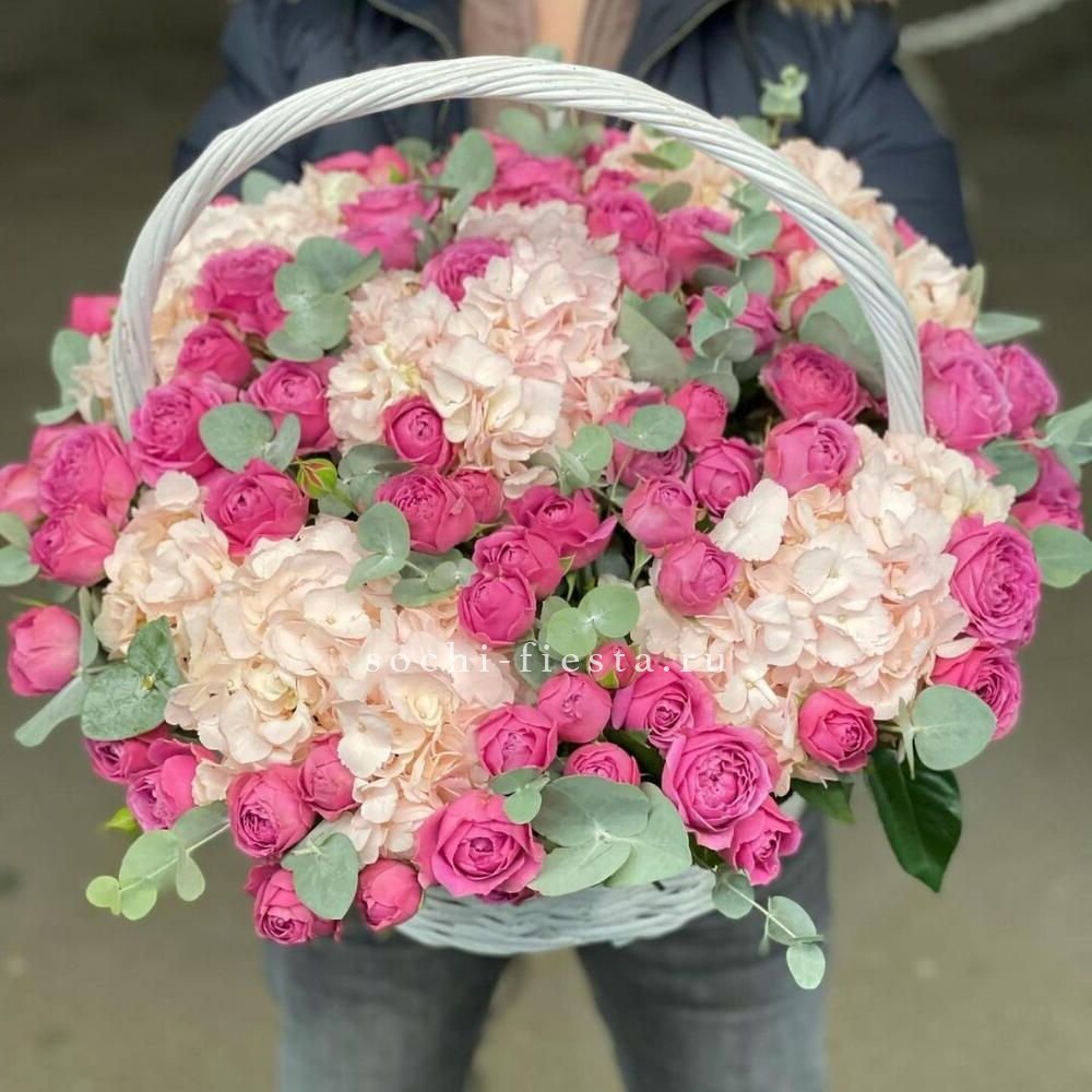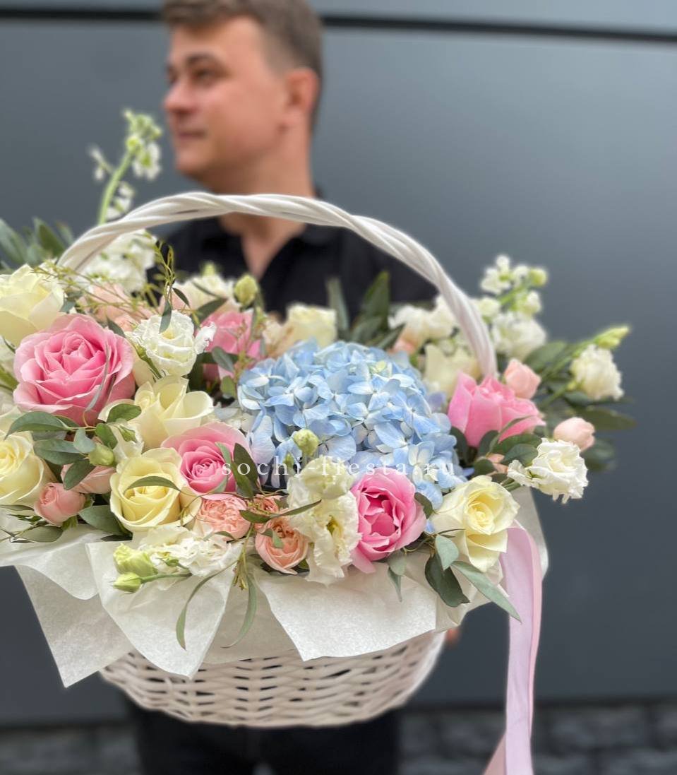 гортензии, мисти баблс, эвкалипт (круглолистый или остролистый в зависимости от сезона), лента, светлая корзина D40.