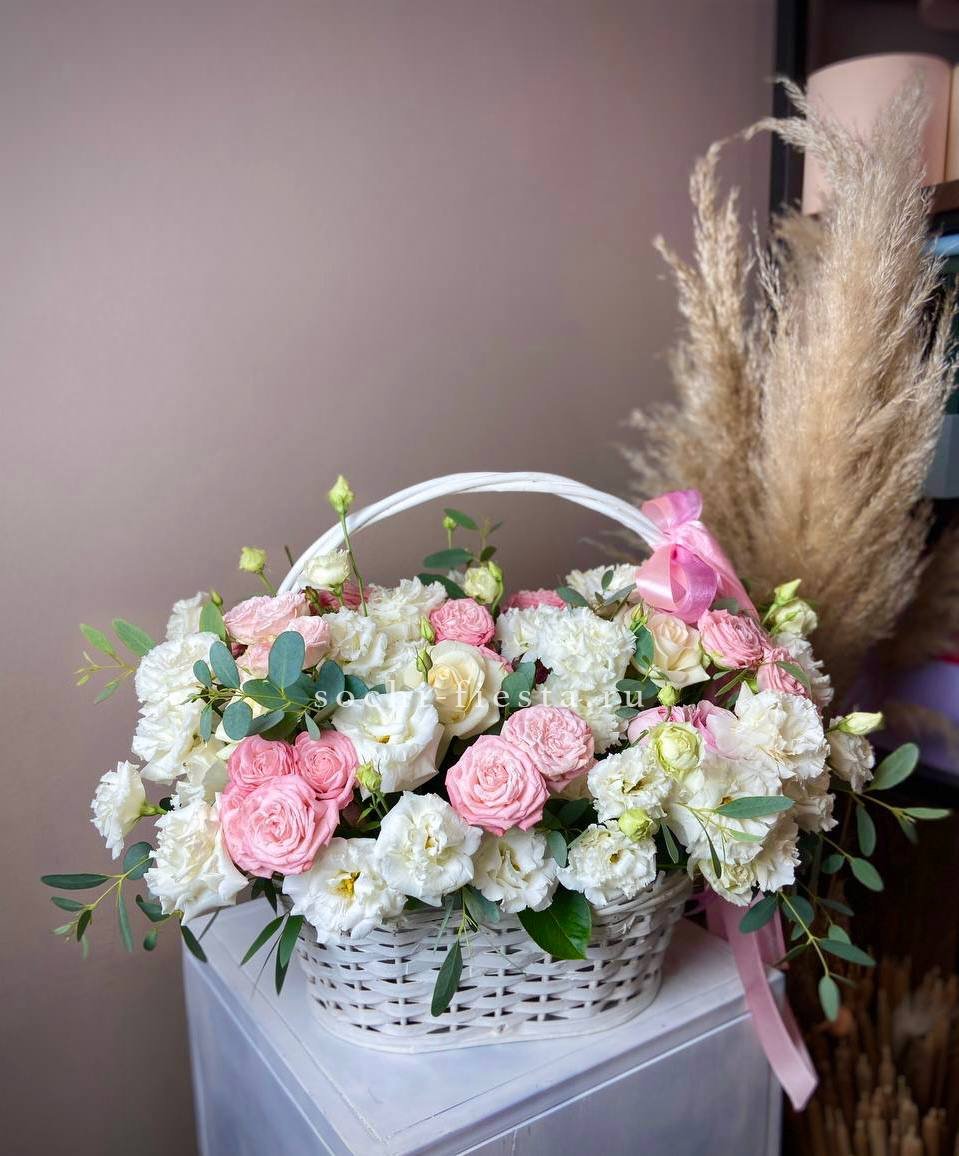 розы, кустовые розы, гортензия, маттиола (или аналог вне сезона), эустома, эвкалипт, лента, дизайнерская упаковка.
