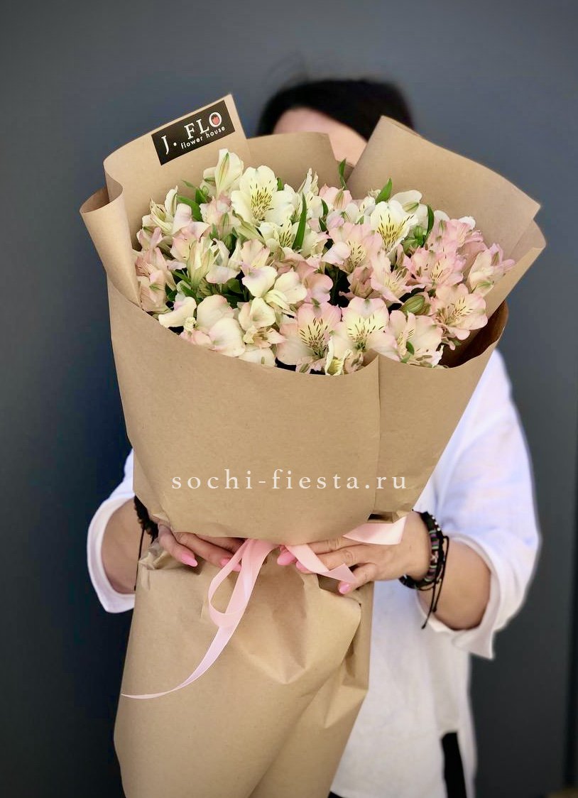 Семнадцать веток альстромерии в крафте выглядят свежо и лаконично. Соцветия распускаются поочерёдно, продлевая жизнь букета на несколько дней.