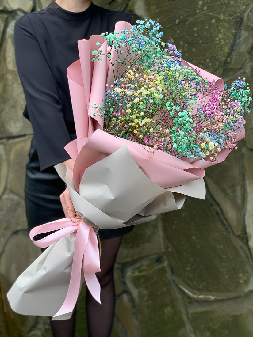 Пять веток гипсофилы раскрашены в спектр от розового до голубого. Пышная воздушная масса мелких цветков формирует лёгкий и жизнерадостный образ.