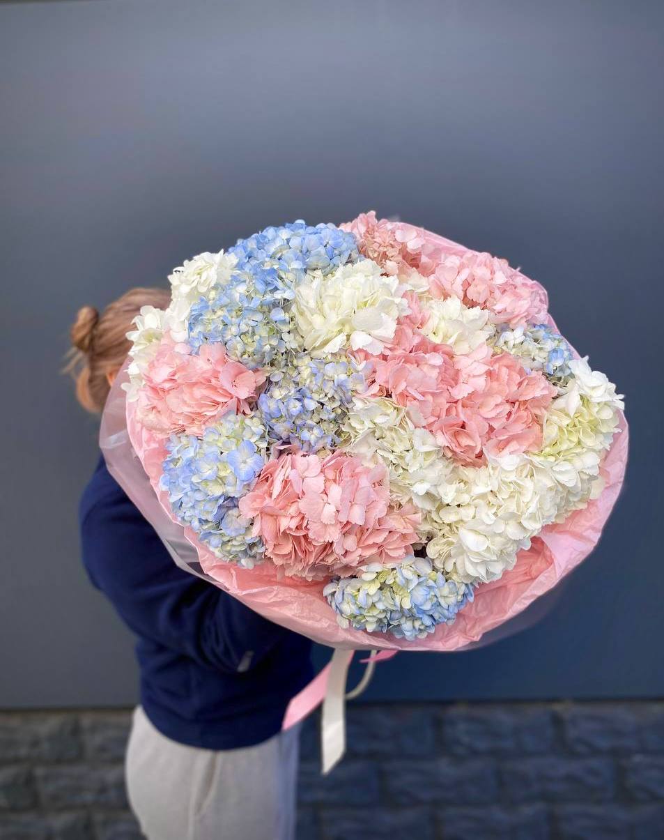 Девятнадцать соцветий гортензии собраны в объемную композицию с естественной воздушностью. Каждая головка раскрывается множеством мелких лепестков, создавая плотное цветовое облако.