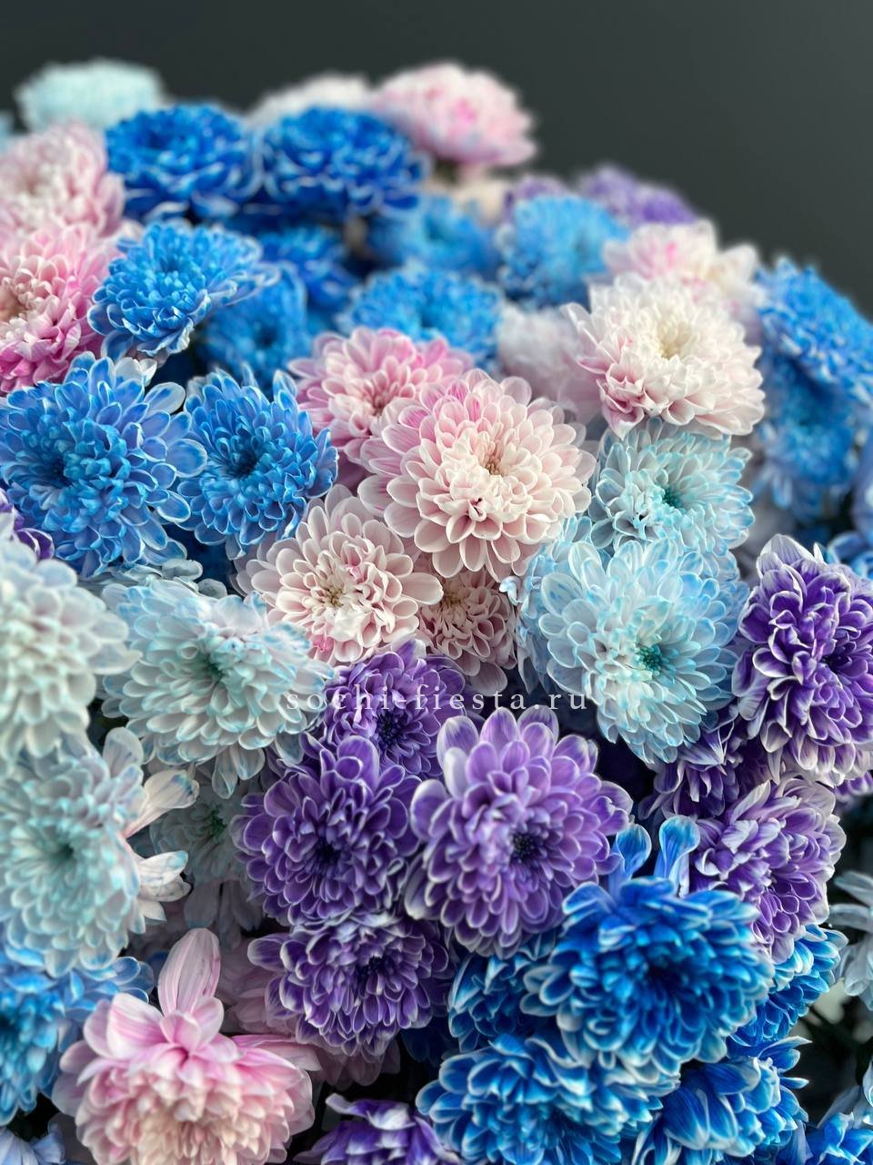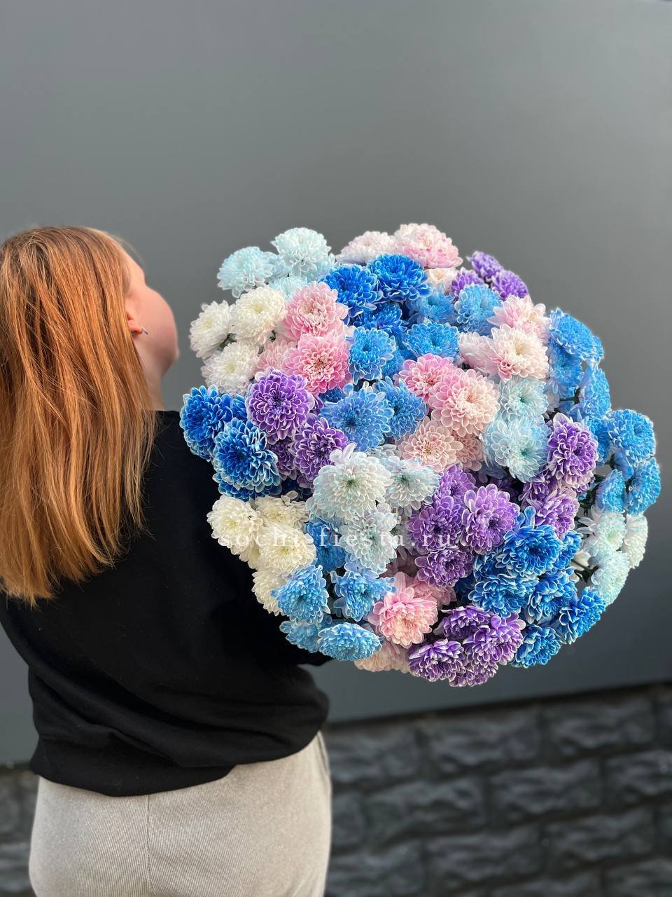Двадцать пять веток кустовой хризантемы в миксе оттенков образуют живописное полотно. Каждый цвет звучит самостоятельно и при этом перетекает в соседний, создавая динамичную композицию.