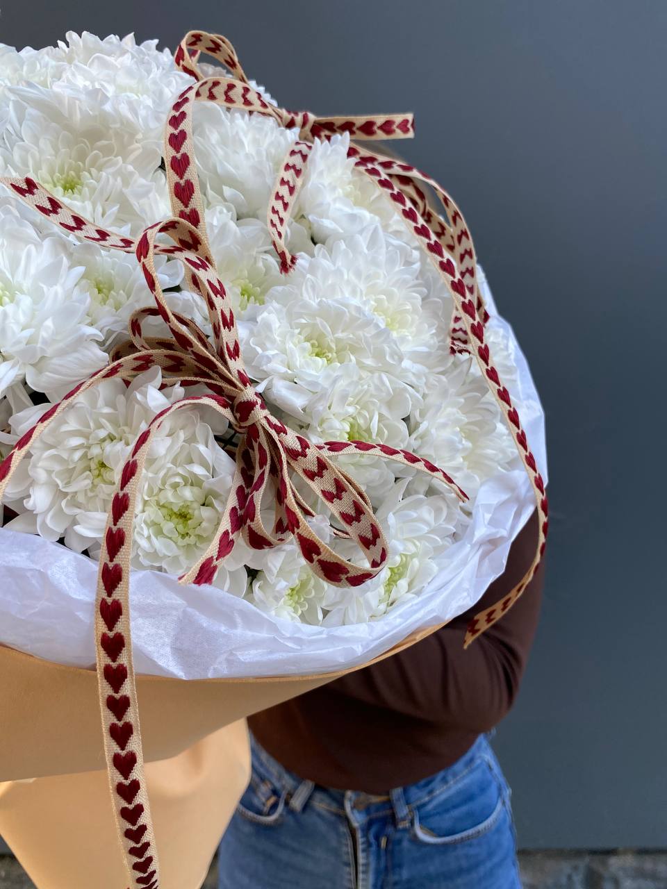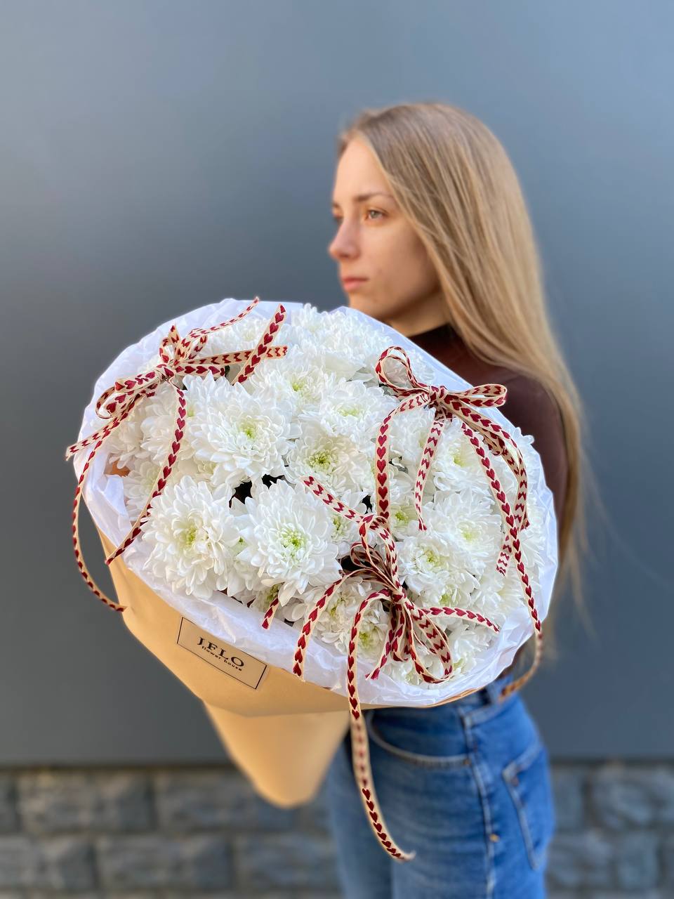 Семь пышных соцветий хризантемы с игривыми завитыми лепестками собраны в плотную композицию. Золотистый эвкалипт добавляет теплое мерцание и завершает образ. Яркий жест для тех, кто любит выразительные формы и живую энергию цветов.