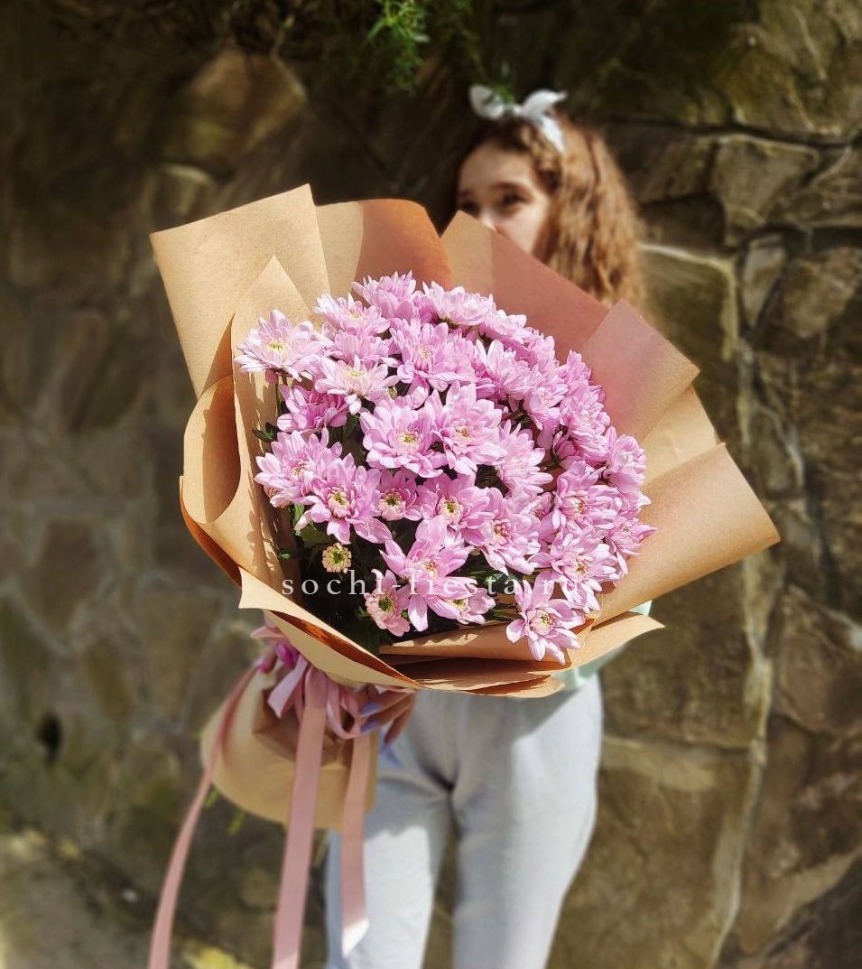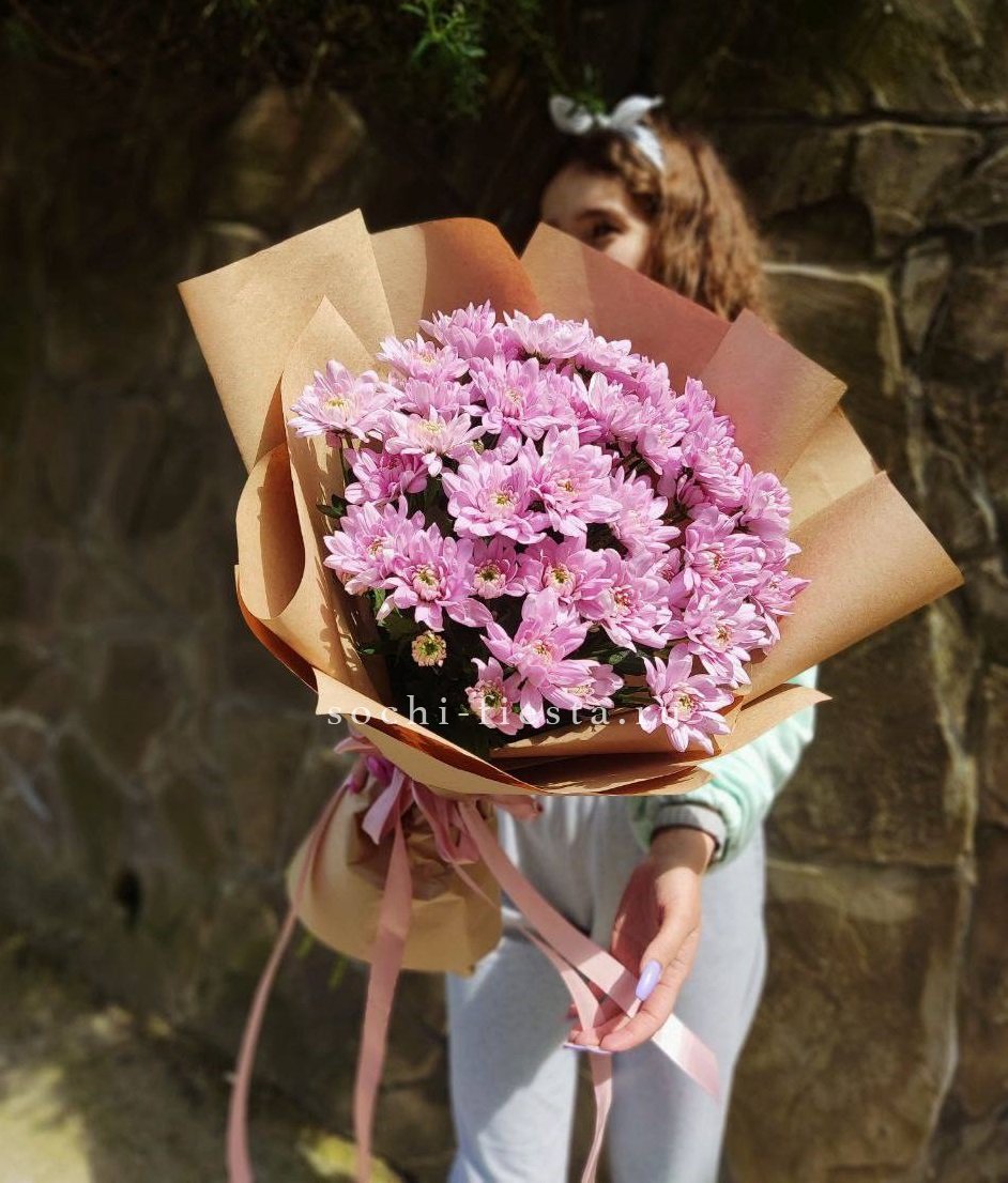 Одиннадцать веток кустовой хризантемы с множеством бутонов разной степени раскрытия. Воздушная композиция долго сохраняет свежесть и радует обилием мелких соцветий в лаконичной упаковке.