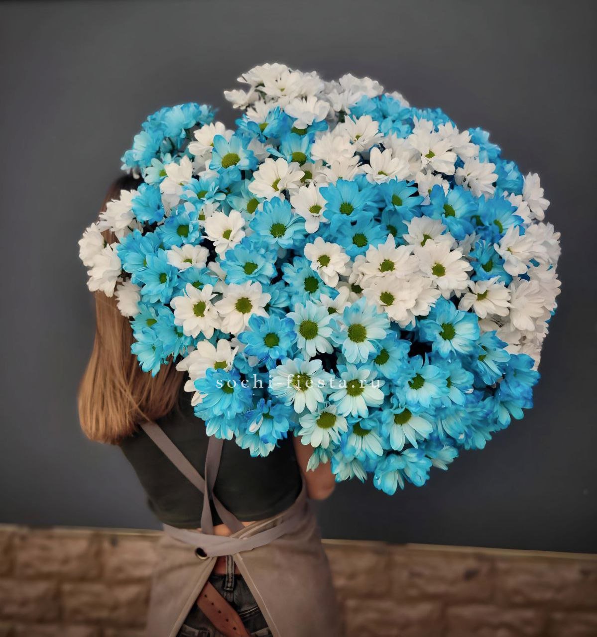 Пятьдесят одна ветка кустовых хризантем в миксе оттенков — это впечатляющий объем и буйство красок. Первый взгляд захватывает масштабом и многослойностью цветовой палитры.