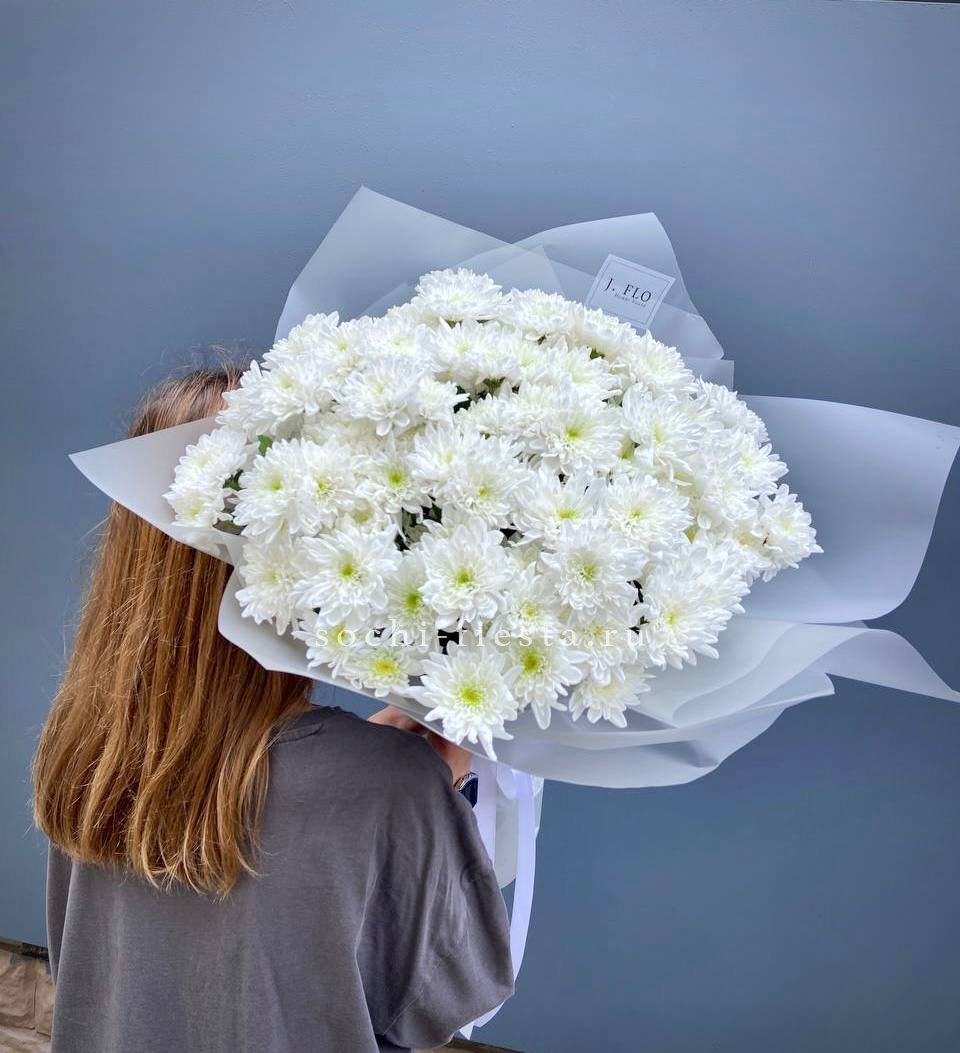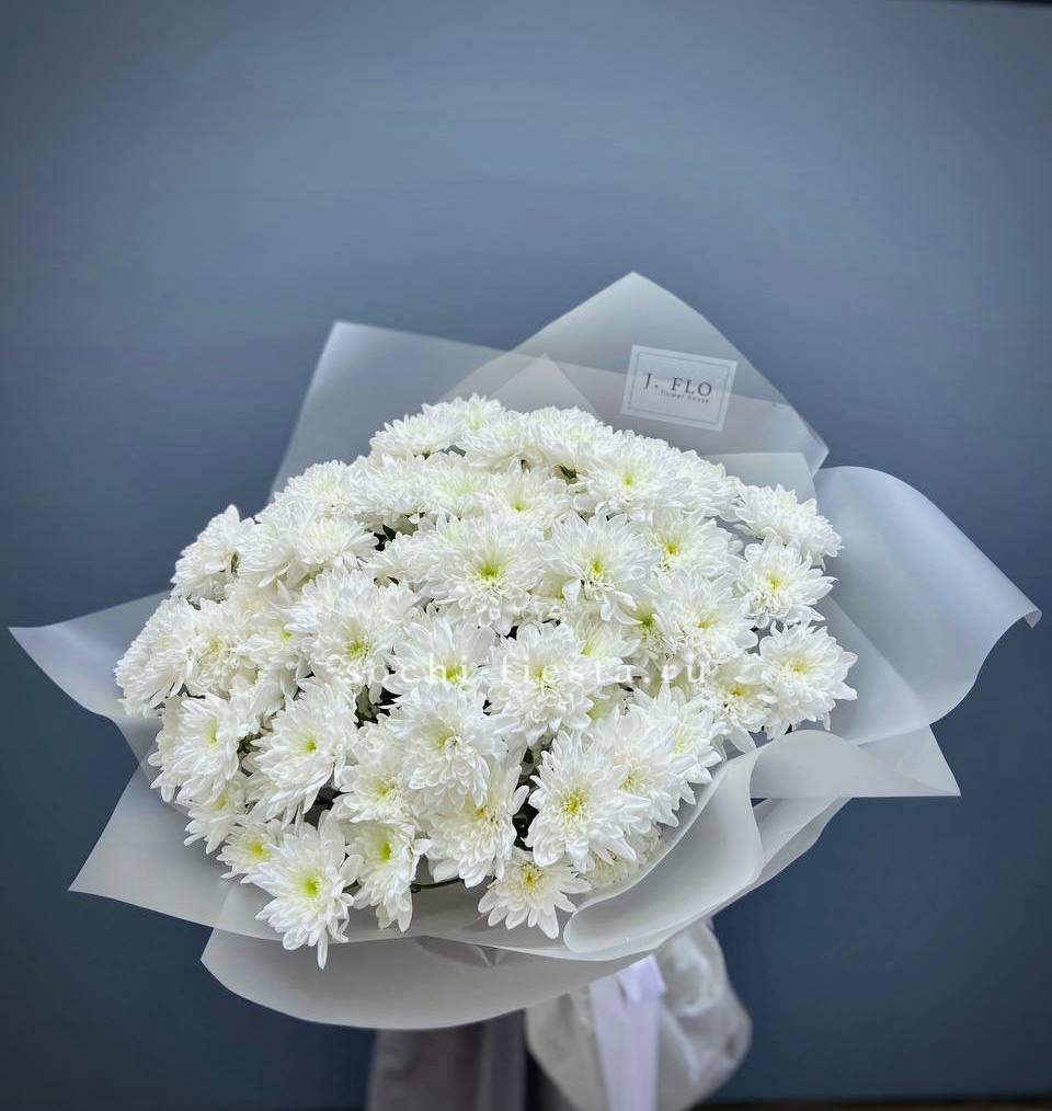 хризантемы - 7 шт, эвкалипт,  лента, дизайнерская упаковка.