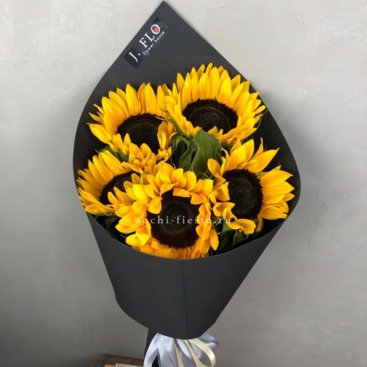 5 подсолнухов, лента, авторское оформление.