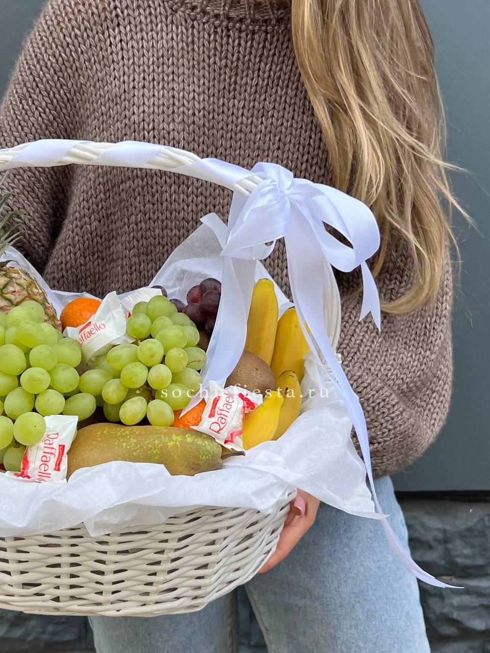 фруктовая композиция в корзине из винограда, бананов, яблок, мандарин, киви, ананаса и Raffaello