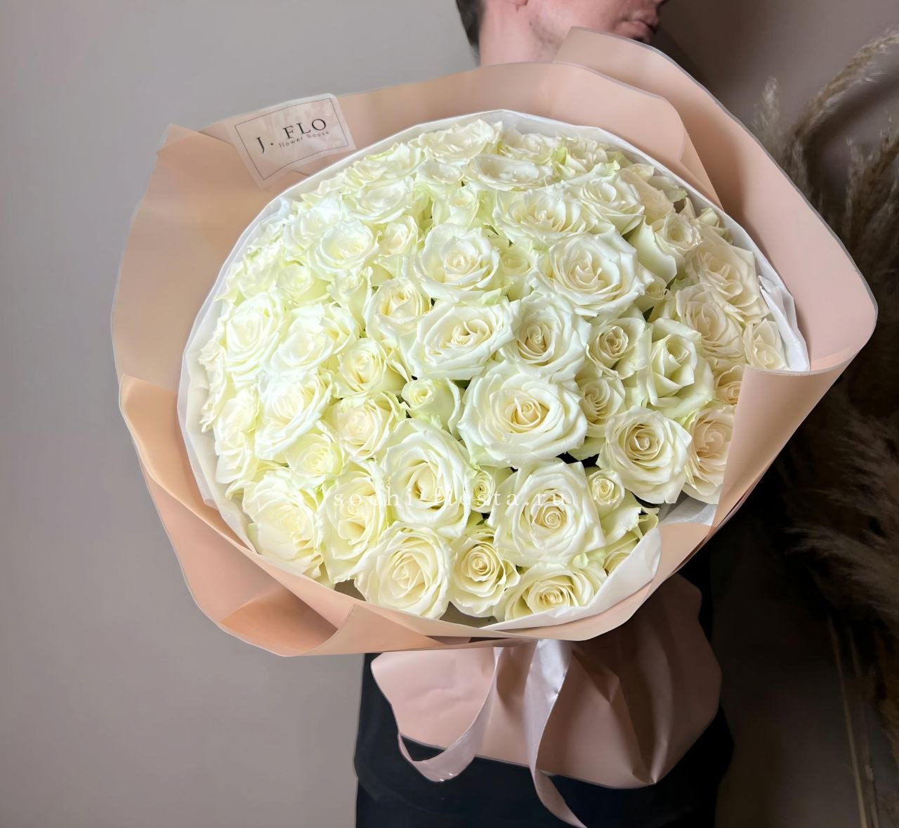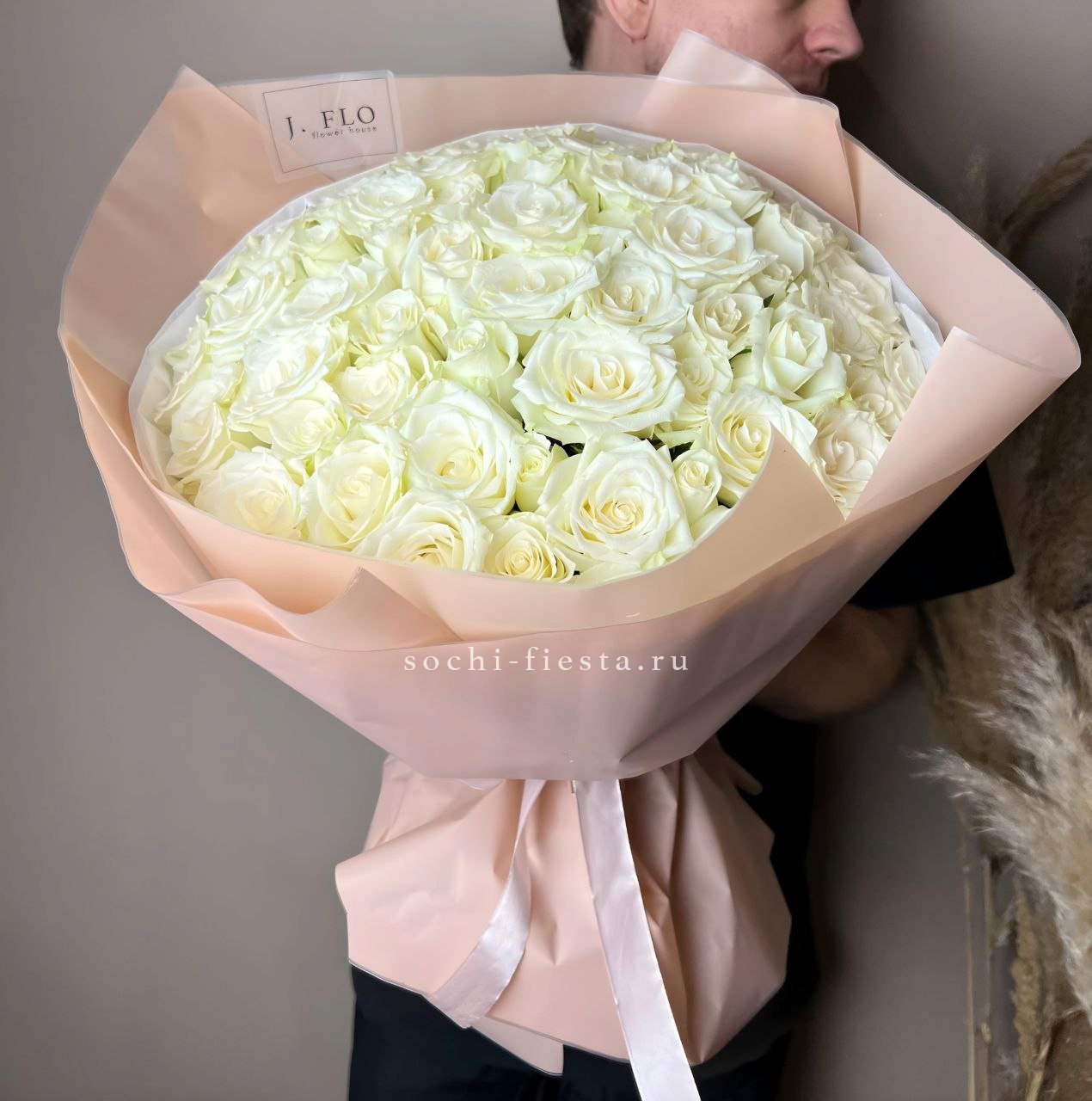 Классический букет из пятнадцати белых роз в упаковке из фоамирана держит форму и остается свежим долгое время. Компактная композиция удобна для транспортировки и размещения в любом интерьере.