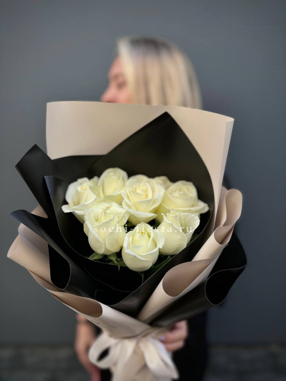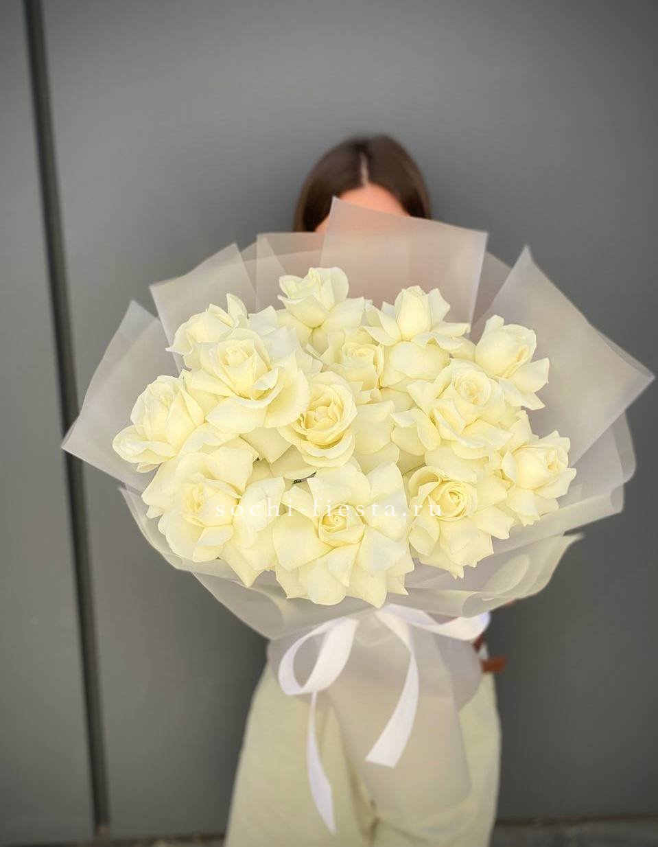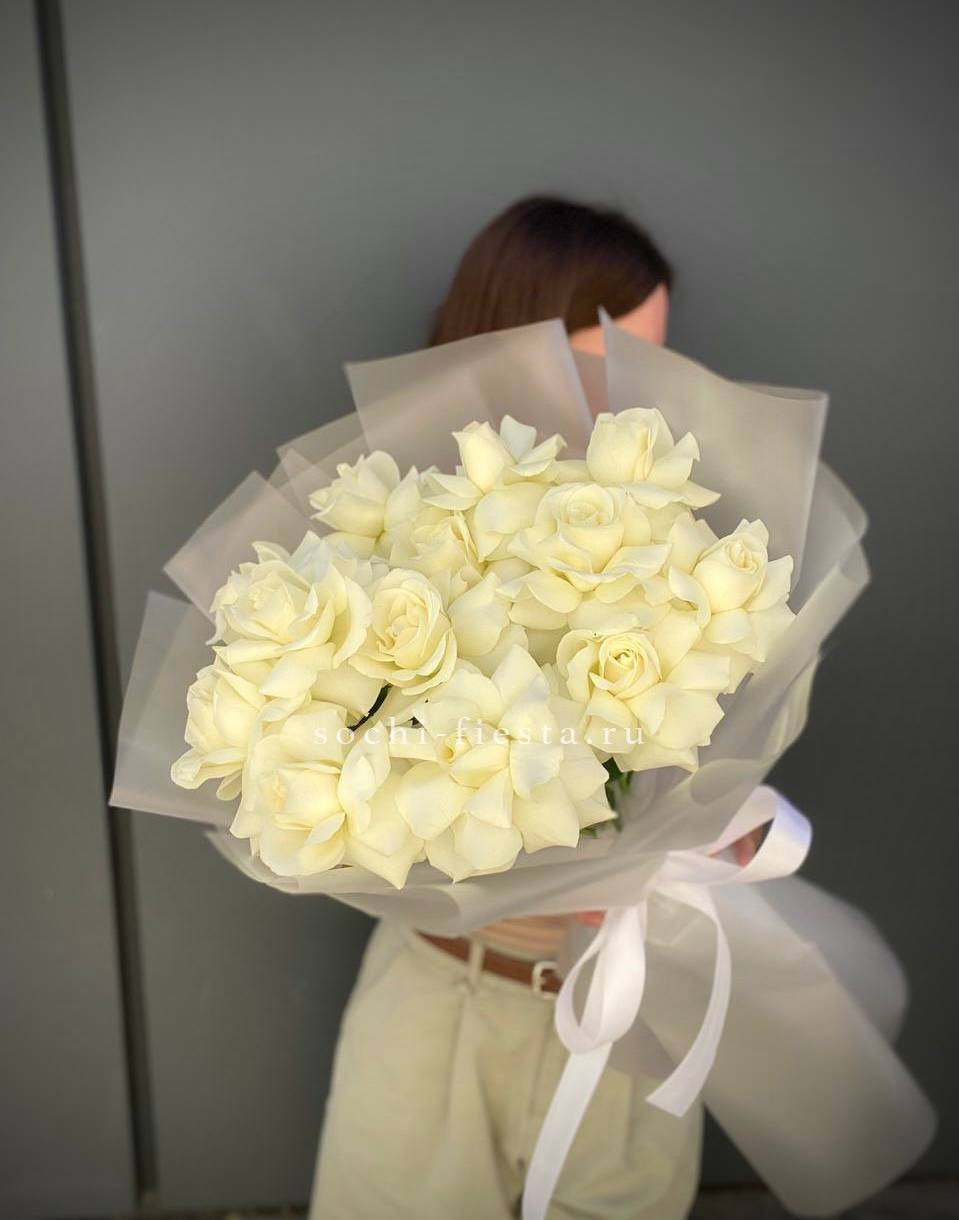 Пятнадцать белых роз в тонкой дизайнерской упаковке создают ощущение лёгкости и чистоты. Матовая текстура бумаги и мягкие складки подчёркивают форму каждого бутона. Композиция выглядит свежо и современно.