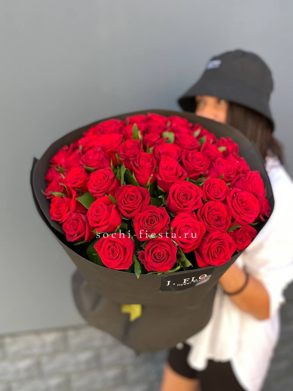 Двадцать три бутона выстроены в плотную округлую форму с чёткими линиями и выразительным силуэтом. Французские розы держат форму уверенно, а свежая зелень добавляет композиции графичности и завершённости.