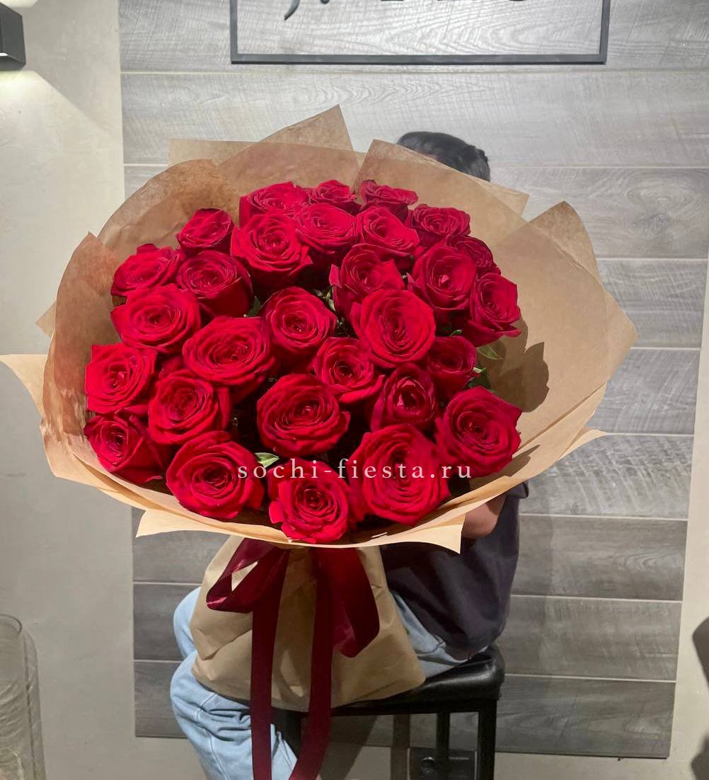 Красный монохром из пятидесяти одной розы притягивает взгляд своей насыщенностью. Крупная композиция заполняет пространство и создает яркое визуальное впечатление.