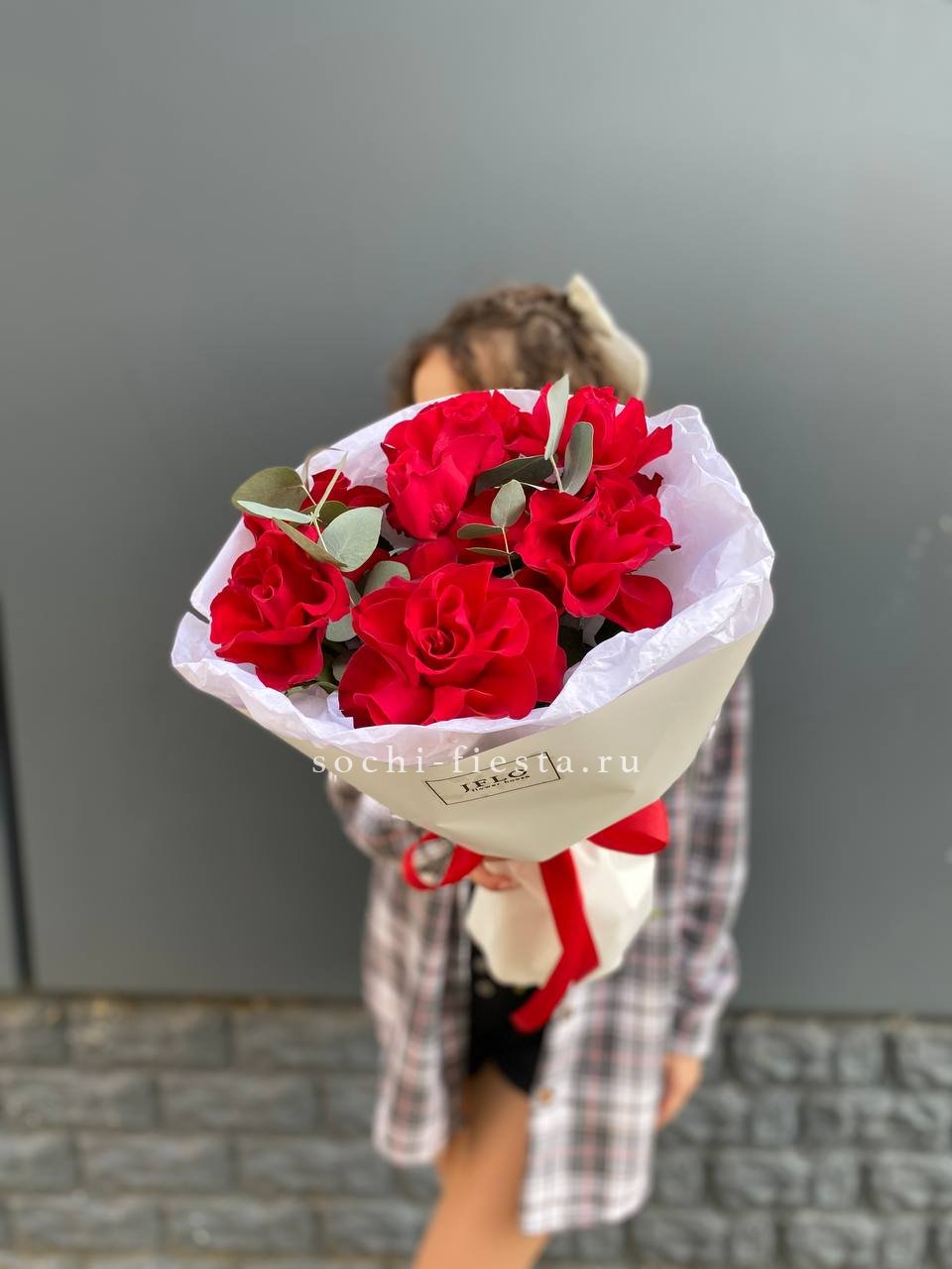 Семь французских роз с крупными бутонами и густой фактурой лепестков. Красный цвет звучит насыщенно и глубоко, а эвкалипт добавляет свежести композиции.