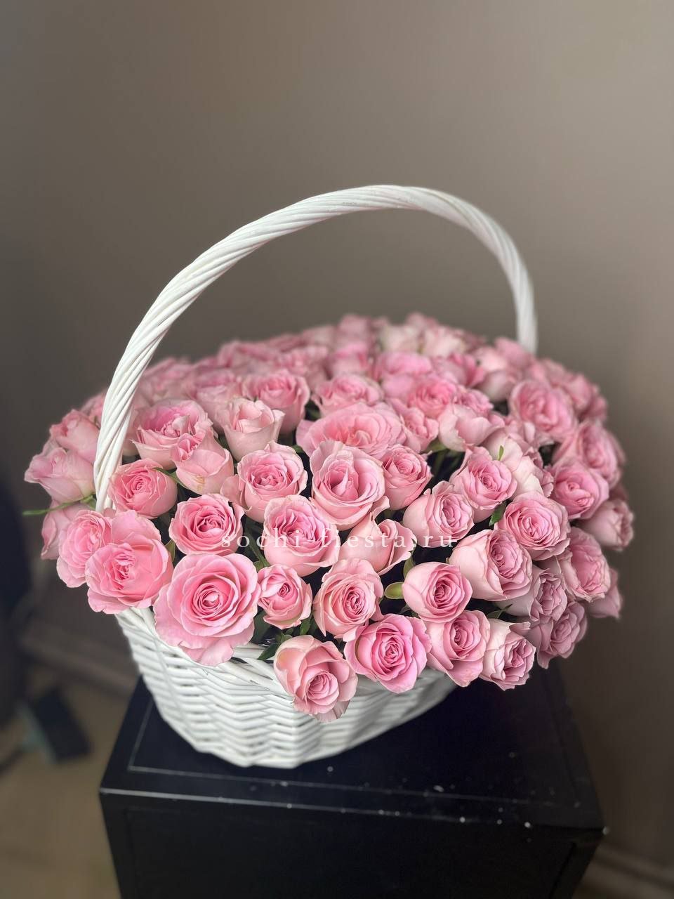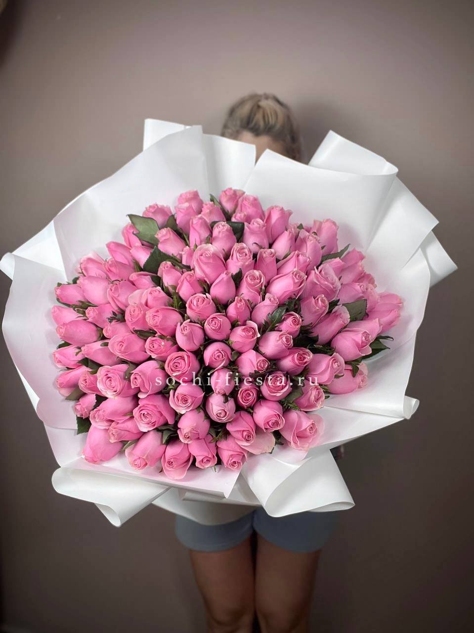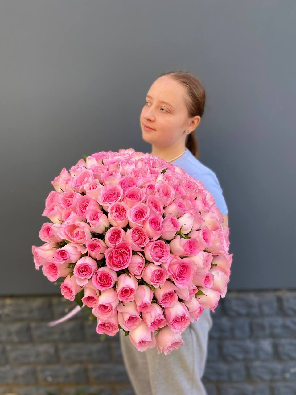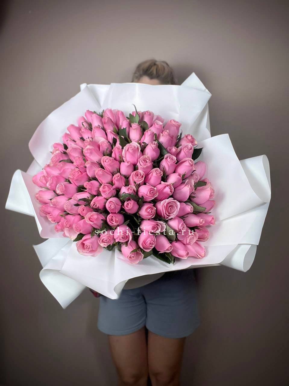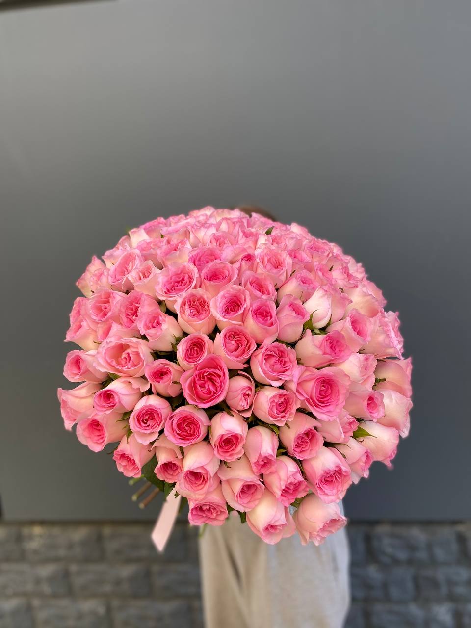 Сто одна роза в розовой гамме выстраивается в масштабную композицию. Такой букет заполняет всё видимое пространство и создаёт впечатление цветочной инсталляции с первого взгляда.