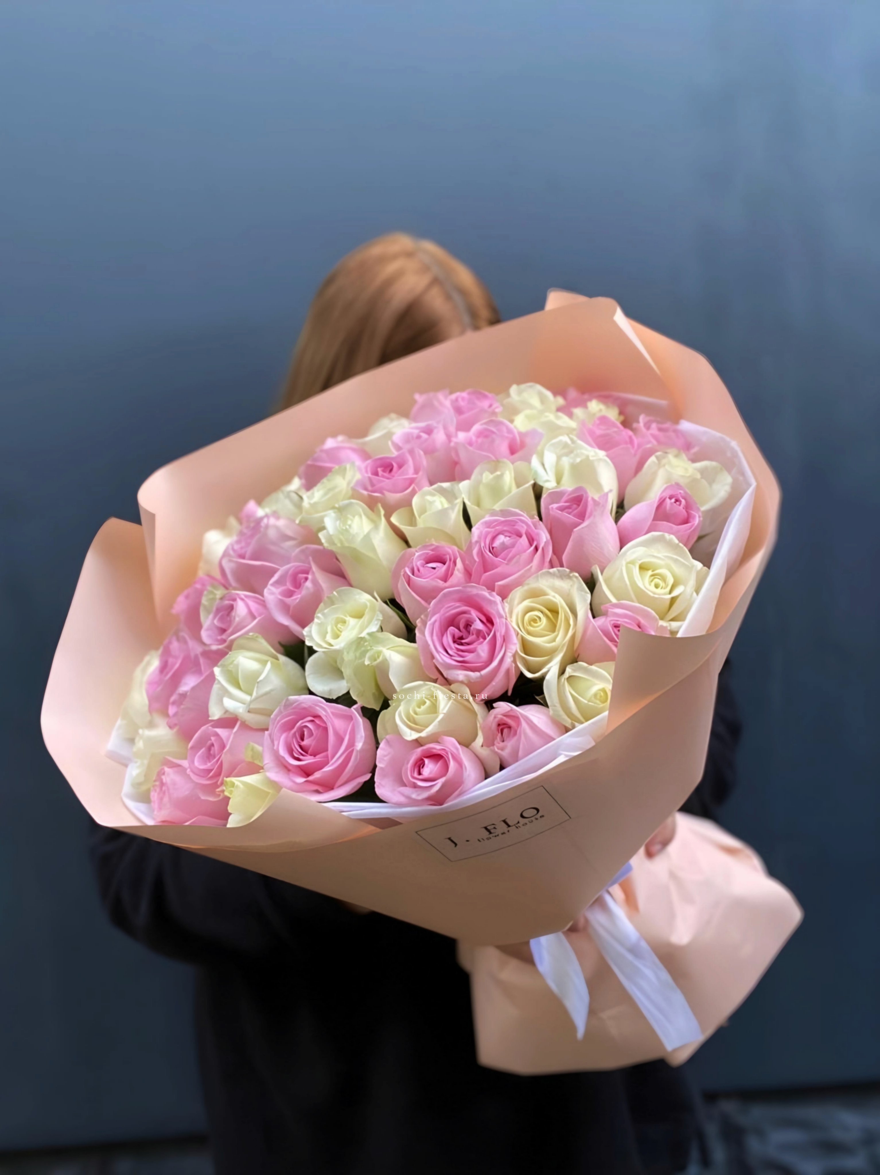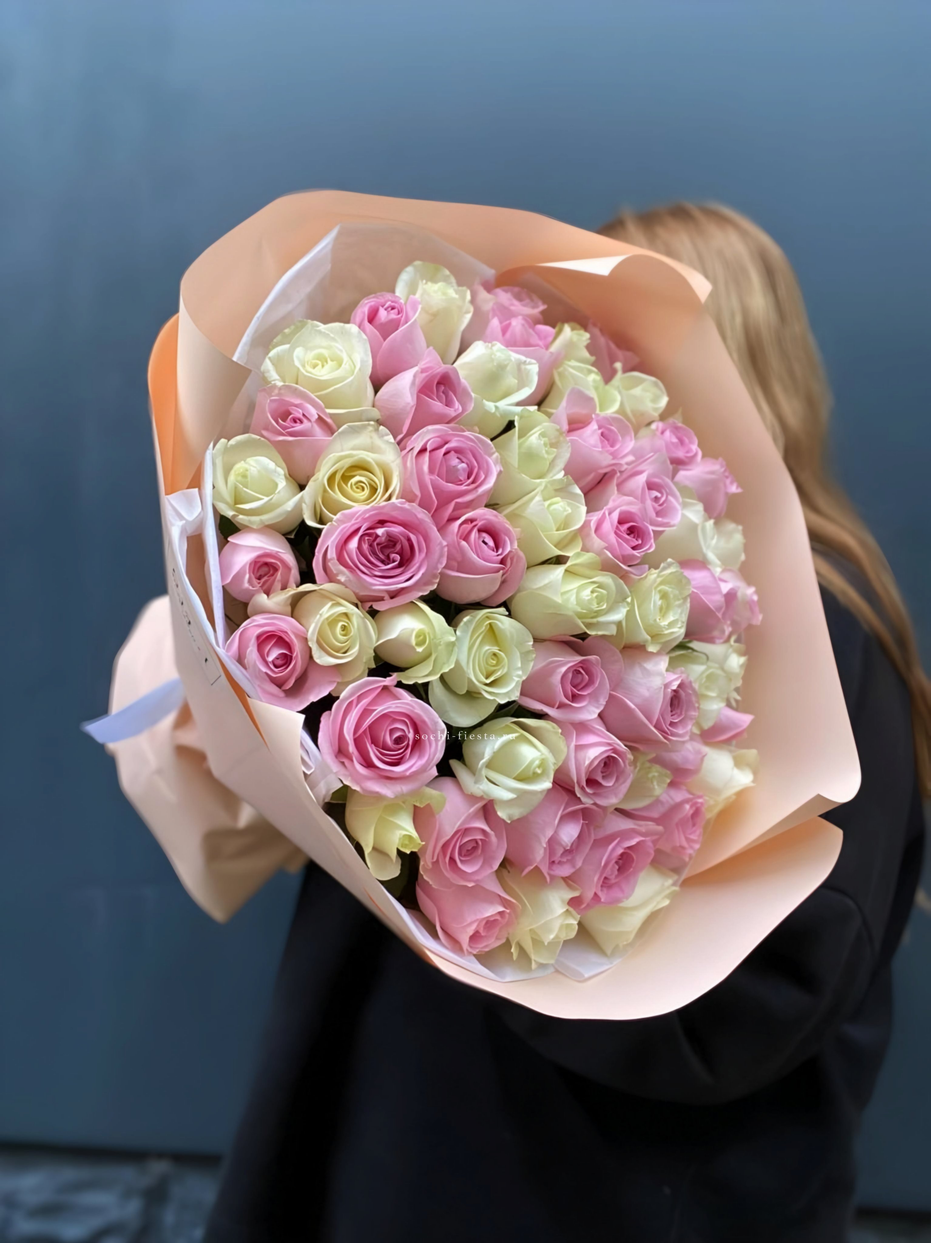 Пятьдесят одна роза собрана в плотный монохромный букет, где каждый бутон создаёт общий объём и глубину. Розовый оттенок раскрывается по-разному в зависимости от света и угла обзора. Композиция впечатляет масштабом и цельностью формы.