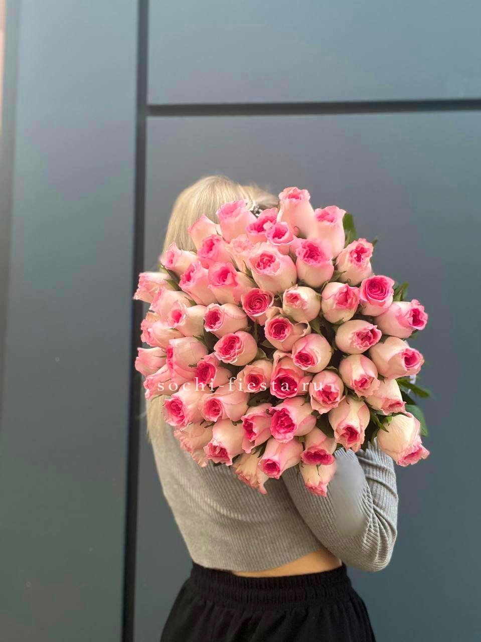 Семьдесят одна роза сорта Маритим образует объемную композицию с плотной структурой. Розовые лепестки создают мягкое цветовое пятно, которое заполняет пространство и удерживает внимание.