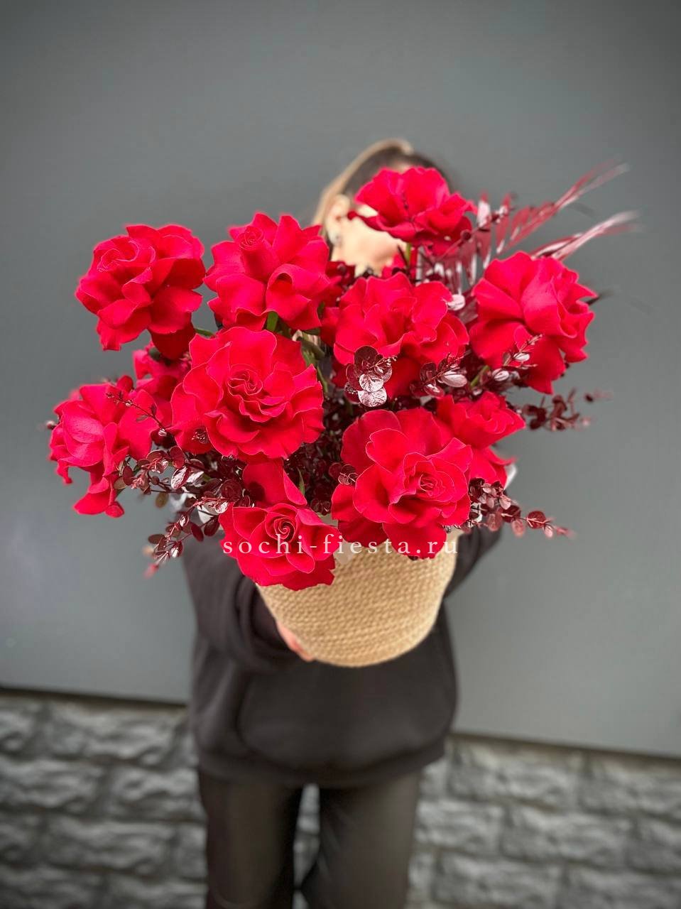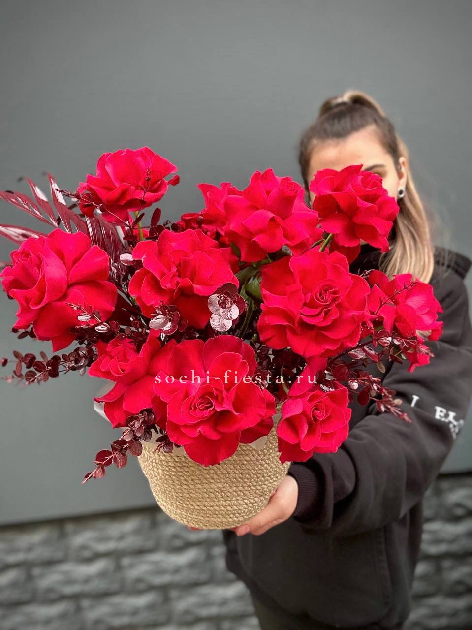 Одиннадцать французских роз с вывернутыми лепестками раскрывают всю глубину бутона. Насыщенный красный цвет и графичная форма создают яркое присутствие.