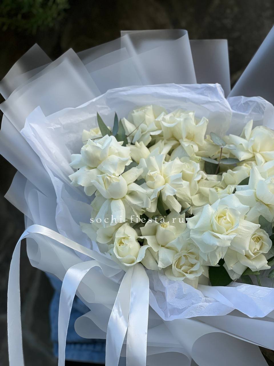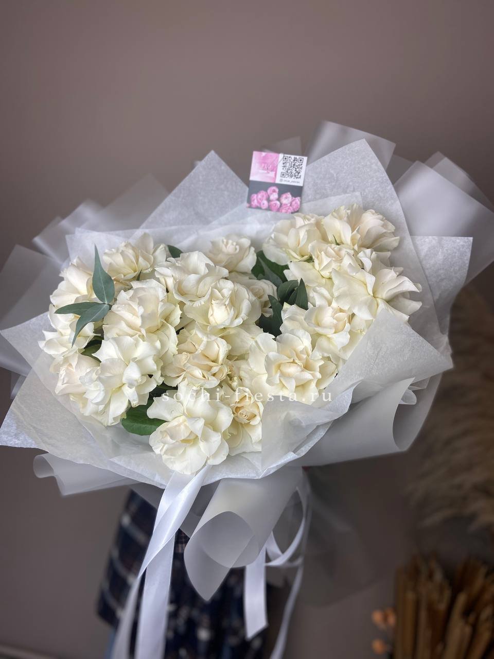 Пять французских роз с вывернутыми лепестками раскрываются широко и создают эффект лёгкой небрежности. Эвкалипт поддерживает форму и добавляет свежести белому цвету.