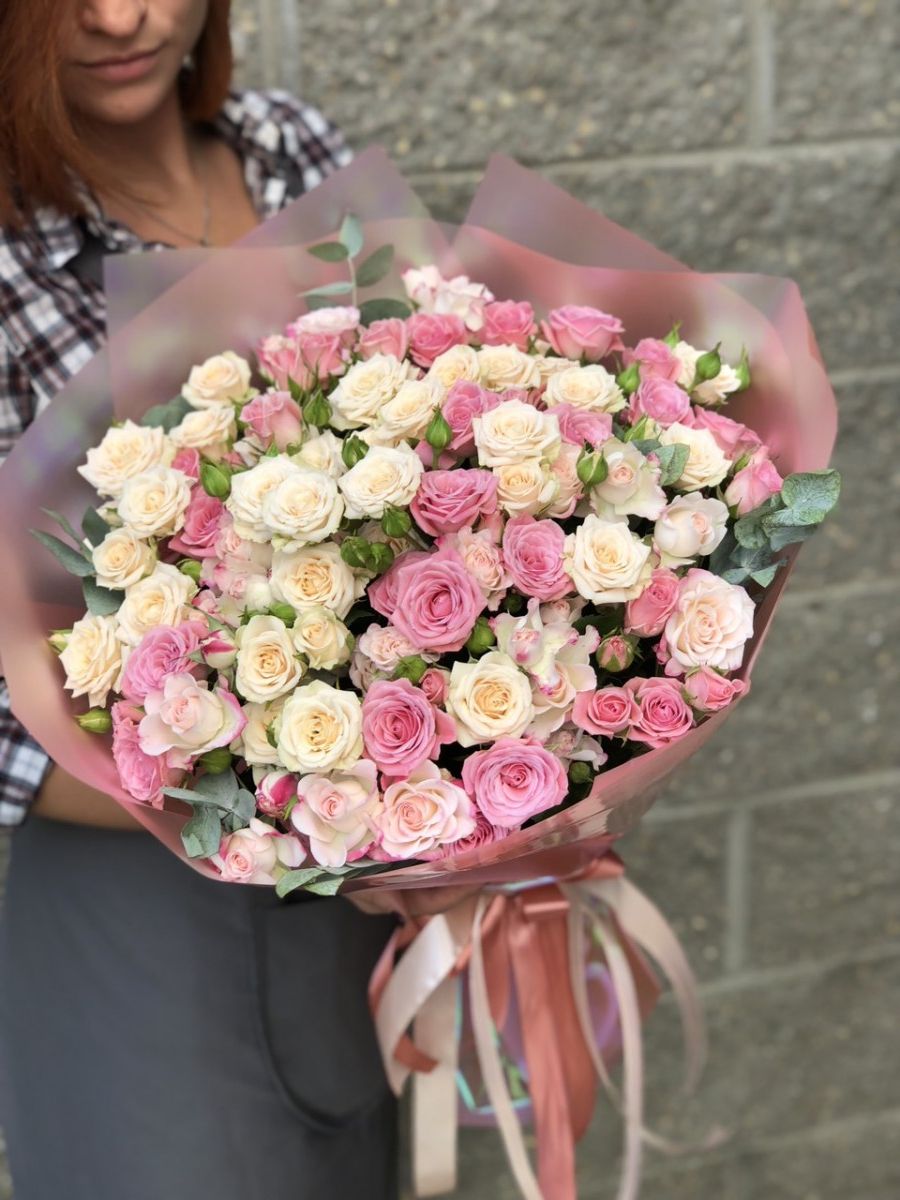 Двадцать один стебель кустовой розы собран в свободную композицию. Многоцветковые веточки формируют воздушный объем с естественным ритмом расположения бутонов.