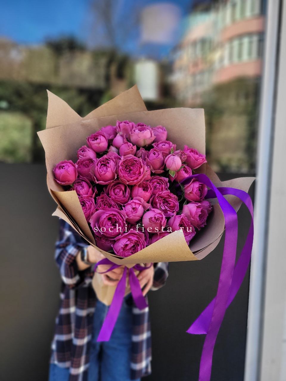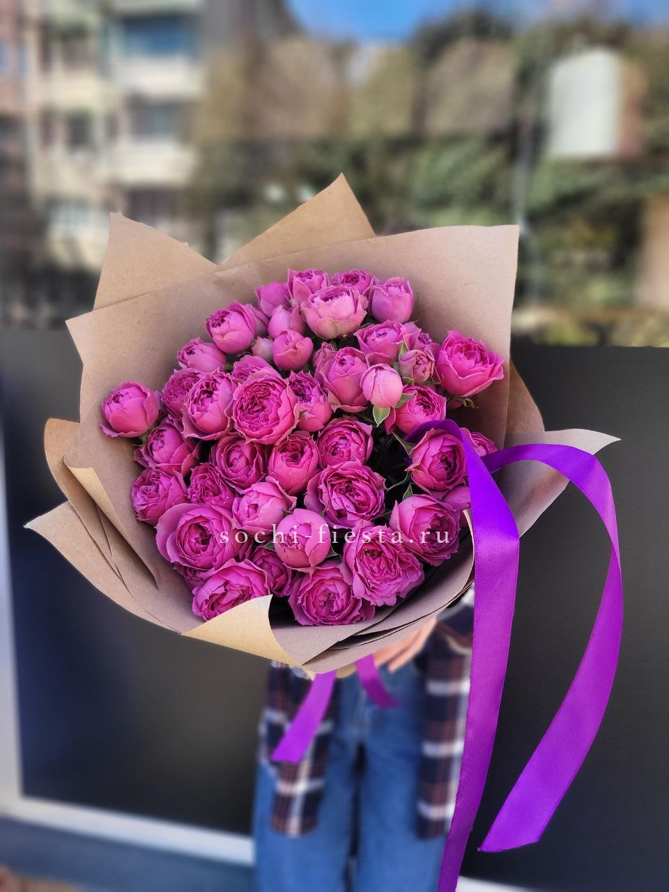 25 пионовидные кустовые розы,  хлопок, лента, дизайнерская упаковка.