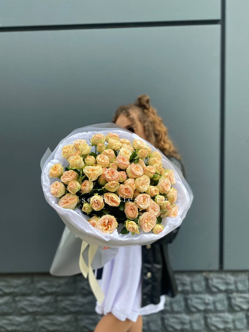 кустовая пионовидная роза, лента, дизайнерская упаковка.