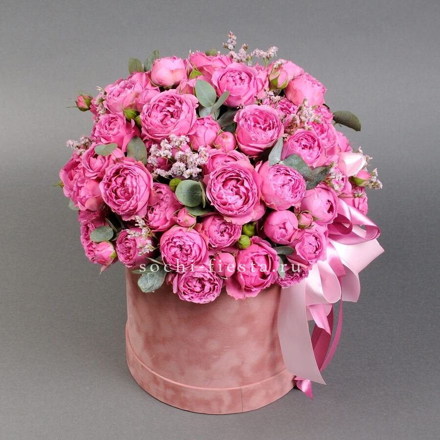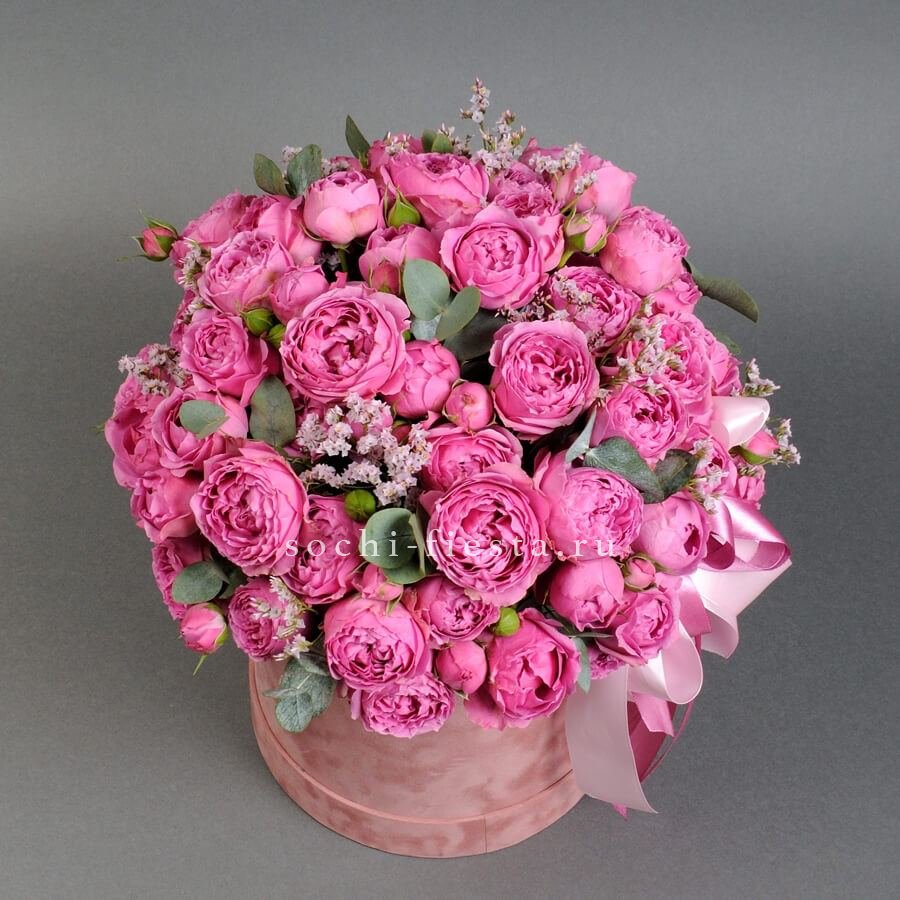 Двадцать пять веток кустовой розы в лавандово-сиреневой палитре собраны в округлую форму. Многочисленные бутоны разной степени раскрытия добавляют динамику и объём.
