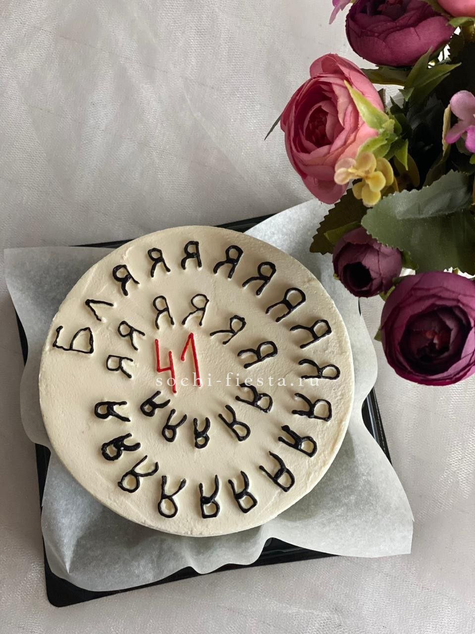 Майская тематика раскрыта через персональную надпись и дизайн кремовой поверхности. Торт выглядит цельно, декор не перегружает композицию. Формат подходит для камерного чаепития.